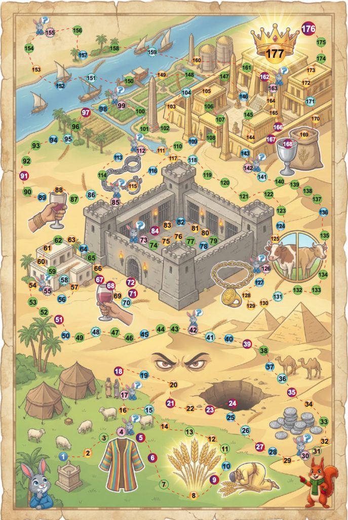 Cum funcționează: Primul joc al seriei îi invită pe jucători să refacă drumul lui Iosif – de la groapă, la palatul lui Faraon. Pe o planșă mare, frumos ilustrată, jucătorii aruncă zarurile și înaintează pe un traseu complex format din 177 de căsuțe. Drumul nu este deloc liniar: este presărat cu „binecuvântări” care te propulsează înainte și „ispite” sau capcane care te încetinesc. Pe parcurs, jucătorii trag cartonașe cu întrebări și acțiuni care le testează cunoștințele.